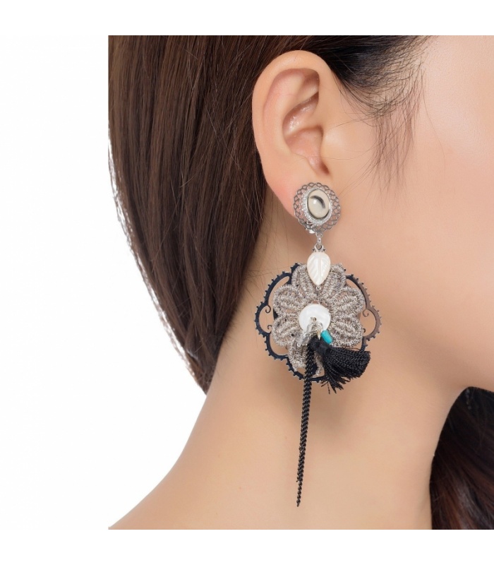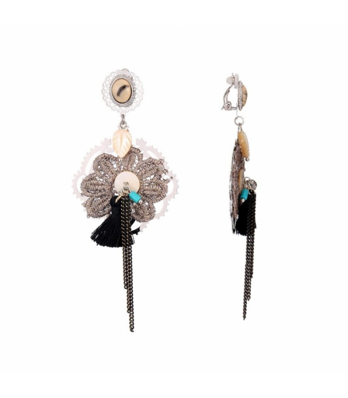 Mooie lange statement oorclips met een zwarte kwast en strengetjes.