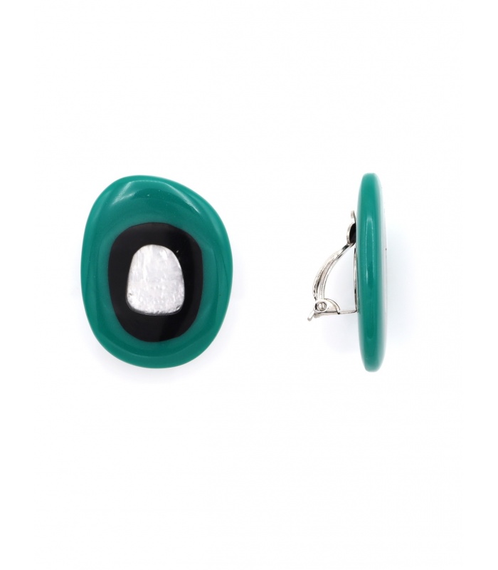 Hoe geef je jouw outfit direct een grafische boost? Deze oorclips combineren groen met zwart en een glanzend zilverkleurig accent in een abstract ovaal design. Ideaal voor liefhebbers van statement oorclips en vintage geïnspireerde sieraden.