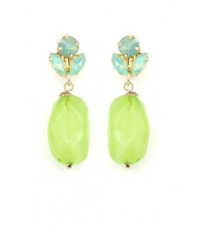 Hoe geef je je outfit instant kleur en stijl? Deze oorclips combineren een zachte mintgroene kraal met fonkelende turquoise stenen bovenaan. De unieke combinatie van vormen en tinten maakt dit een echte blikvanger voor elke gelegenheid.