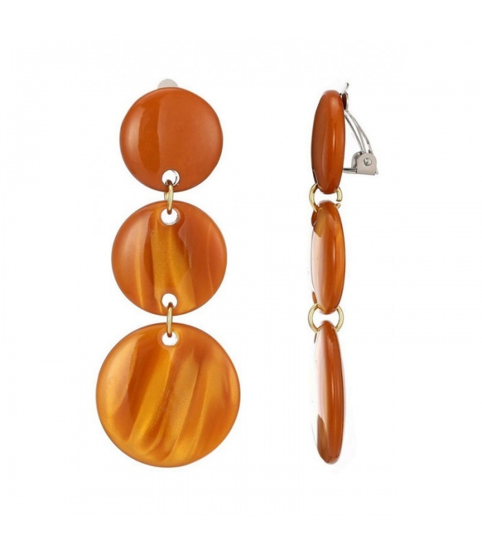 Zijn deze oorclips het ontbrekende statement in jouw look? De drie ronde schijven in warme amberkleur brengen direct een modieuze stijl. Perfect voor wie zoekt naar opvallende, clip oorbellen. Ideaal bij een casual outfit of juist als eyecatcher bij een chique avondlook.