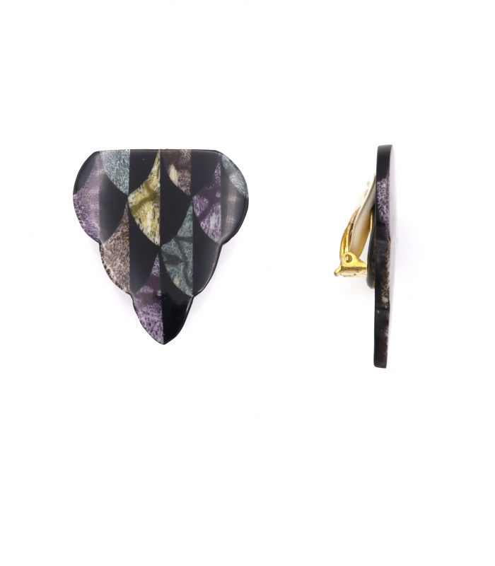 Deze oorclips vallen op door hun unieke vorm en geschubd motief in diepe, gemarmerde kleuren. De combinatie van zwart, paars, goud en blauwgrijs zorgt voor een mysterieuze en elegante uitstraling. Ideaal voor wie net even anders durft te zijn zonder te overdrijven.