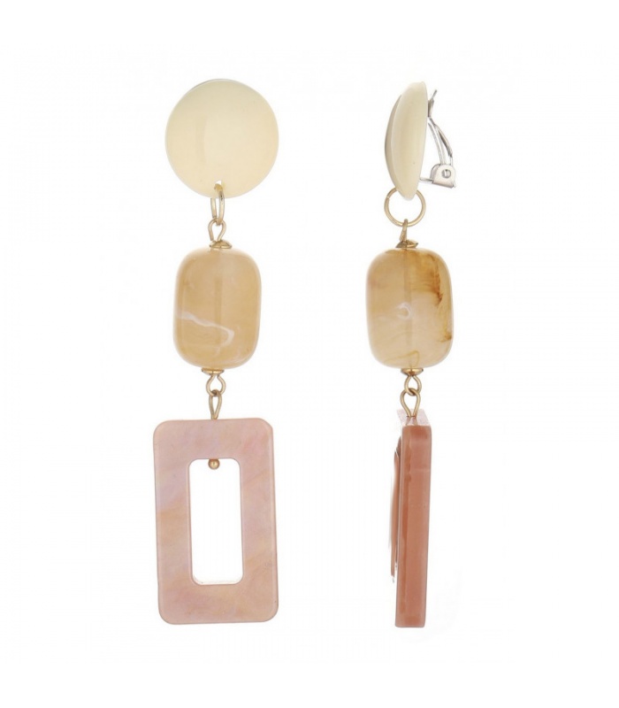 Op zoek naar een elegante kleurcombinatie? Deze oorclips hebben een glanzende beige knop, een warme honingkleurige kraal en een open rechthoekige hanger in zachtroze marmerlook. Een verfijnde keuze voor elke gelegenheid.