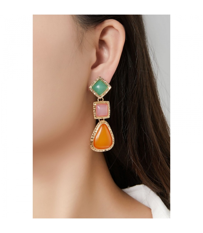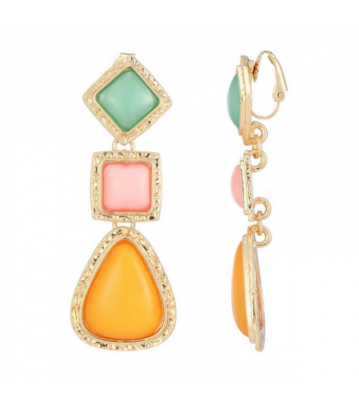 Deze oorclips combineren levendige gekleurde stenen met een elegante goudkleurige omlijsting, wat zorgt voor een opvallende en stijlvolle look. De verschillende vormen van de stenen geven een speels en uniek karakter aan het ontwerp. De clips zijn comfortabel te dragen en ideaal voor wie geen gaatjes heeft.