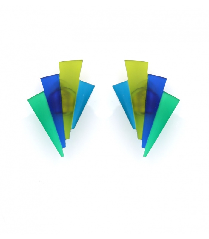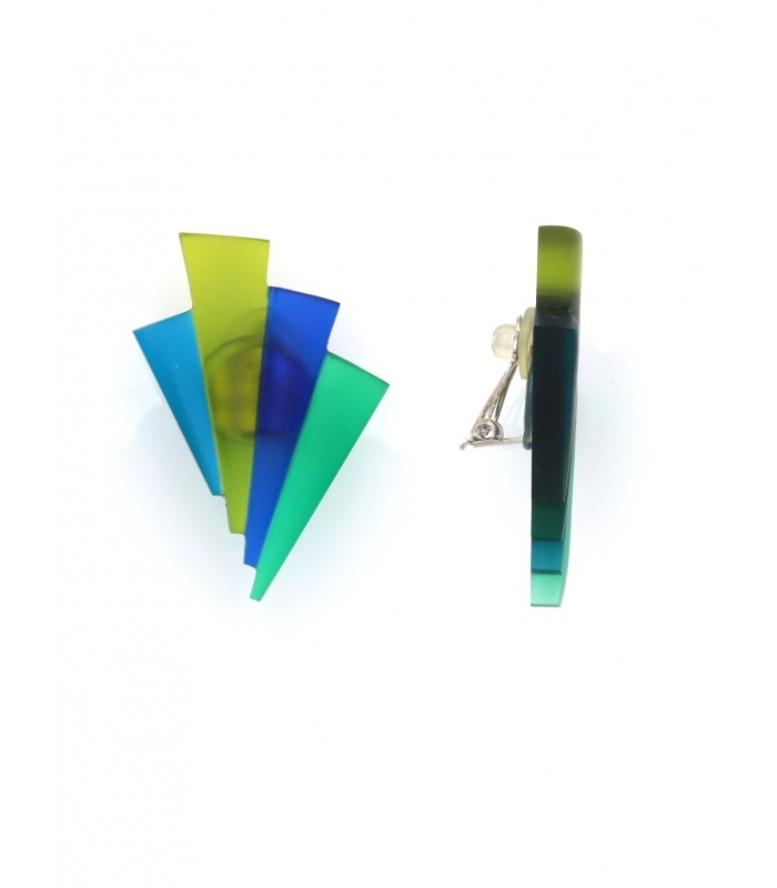 Klaar voor kleur? Deze opvallende oorclips combineren transparant limegroen, diepblauw en helder turquoise in een speelse waaier vorm. Perfect voor wie durft. De geometrische lijnen geven een krachtige retro uitstraling, terwijl de kleuren elke outfit laten knallen. Ideaal voor fashion liefhebbers die op zoek zijn naar unieke statement oorbellen.