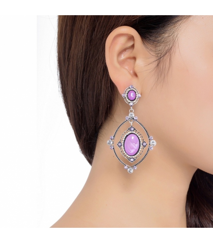 Zilverkleurige oorclips met paarse inleg en stras steentjes.