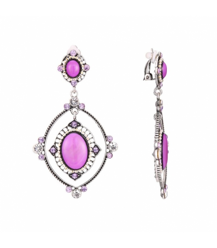 Zilverkleurige oorclips met paarse inleg en stras steentjes