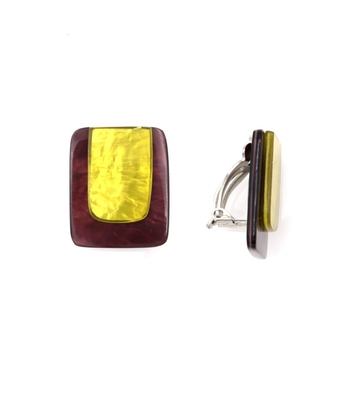 Deze oorclips combineren diepe wijnroodtinten met een glanzend mosterdgeel accent in een rechthoekige vorm. Het contrast tussen de kleuren en de glans maakt ze ideaal voor een opvallende, maar verfijnde look. Een perfecte keuze voor wie van iets speciaal houdt.