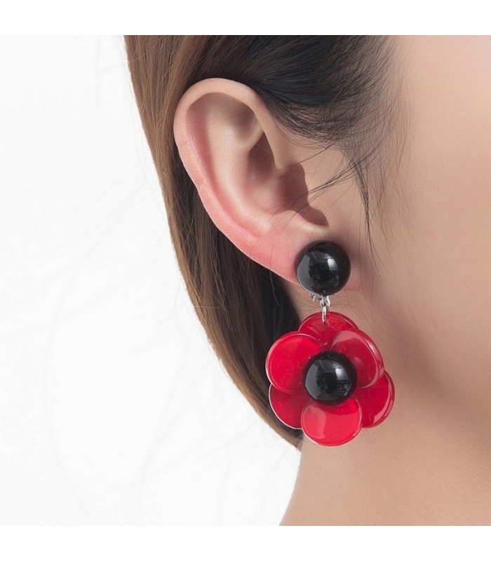 Rode oorclips met een bloemen hanger en een zwart oorstukje