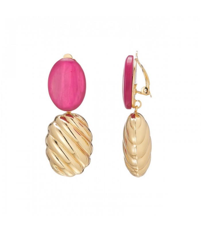 Oorclips: Fuchsia roze met goudkleurige hanger en streepmotief.