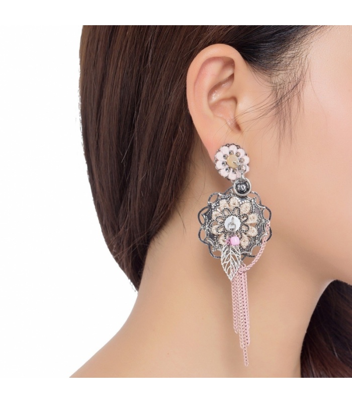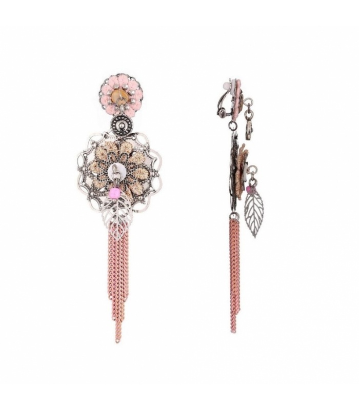 Roze oorclips met stoffen bloemen,bedels,en strengen