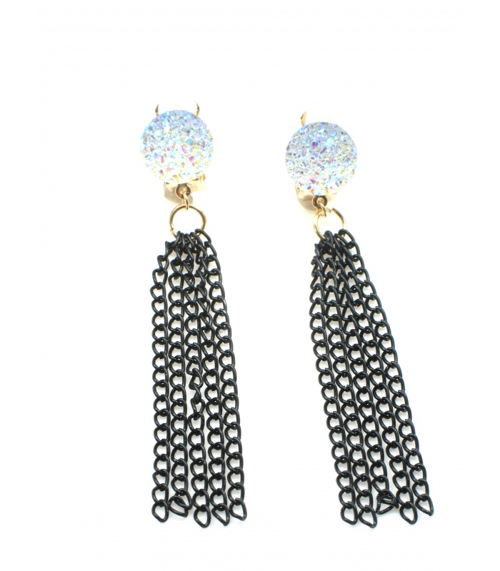 Witte langwerpige oorclips met 5 zwarte jasseron strengen.
