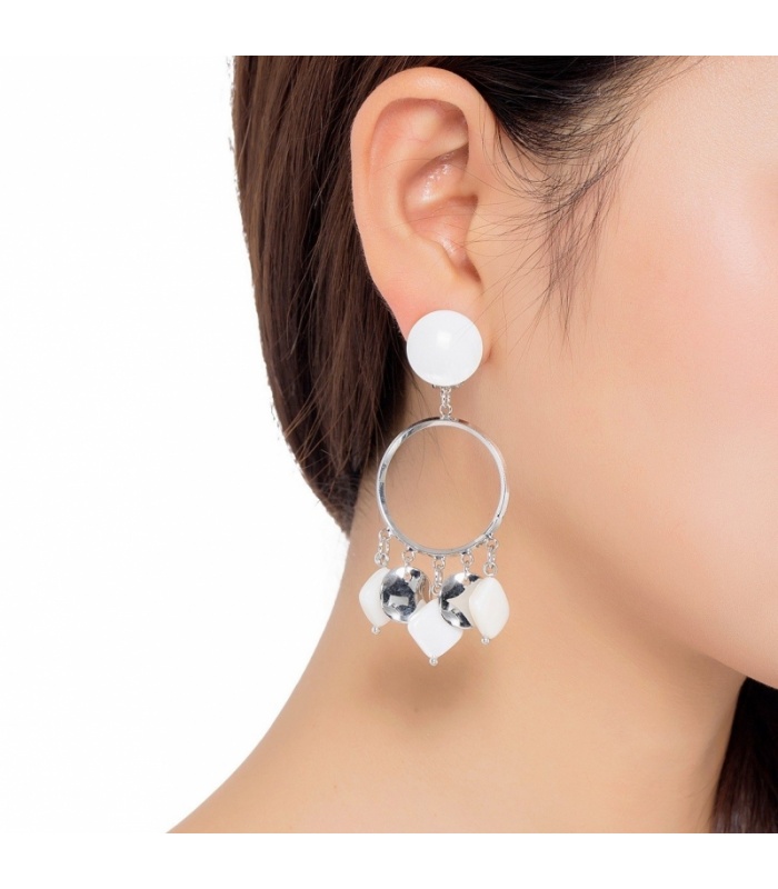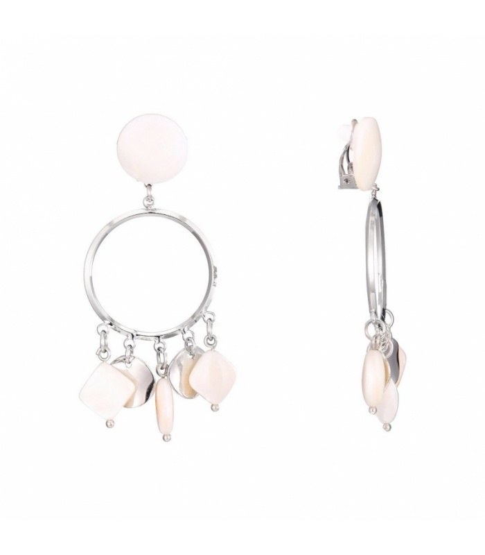 Zilverkleurige oorclips met bedels en witte plaatjes en oorstukje.