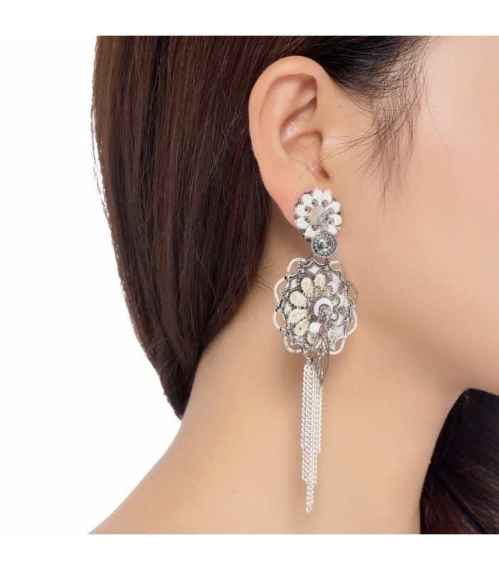 Zilverkleurige oorclips met een witte stoffen bloem, kwast en strengen.
