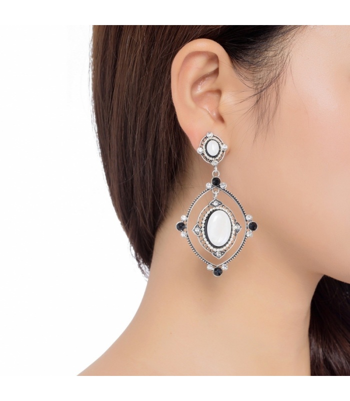 Zilverkleurige oorhanger met een witte resin hanger en strass steentjes