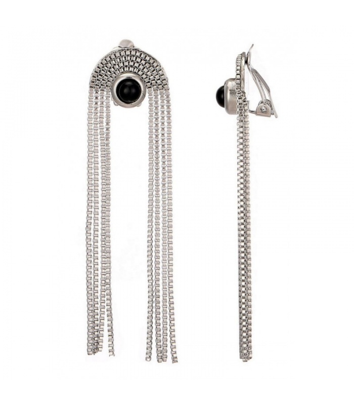 Hoe voeg je een futuristische touch toe aan je outfit? Deze zilverkleurige oorclips met lange kettingfranjes en zwarte steentje creeren een opvallend, gestroomlijnd effect. De ronde vorm bovenaan geeft structuur, terwijl de kettingen bij elke beweging sierlijk meebewegen. Perfect voor een avond vol stijl.