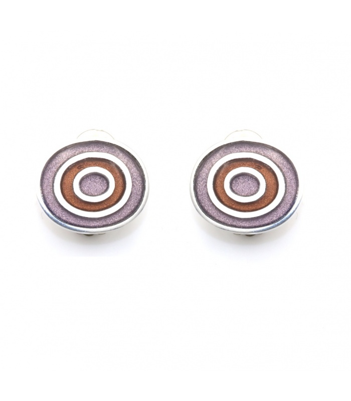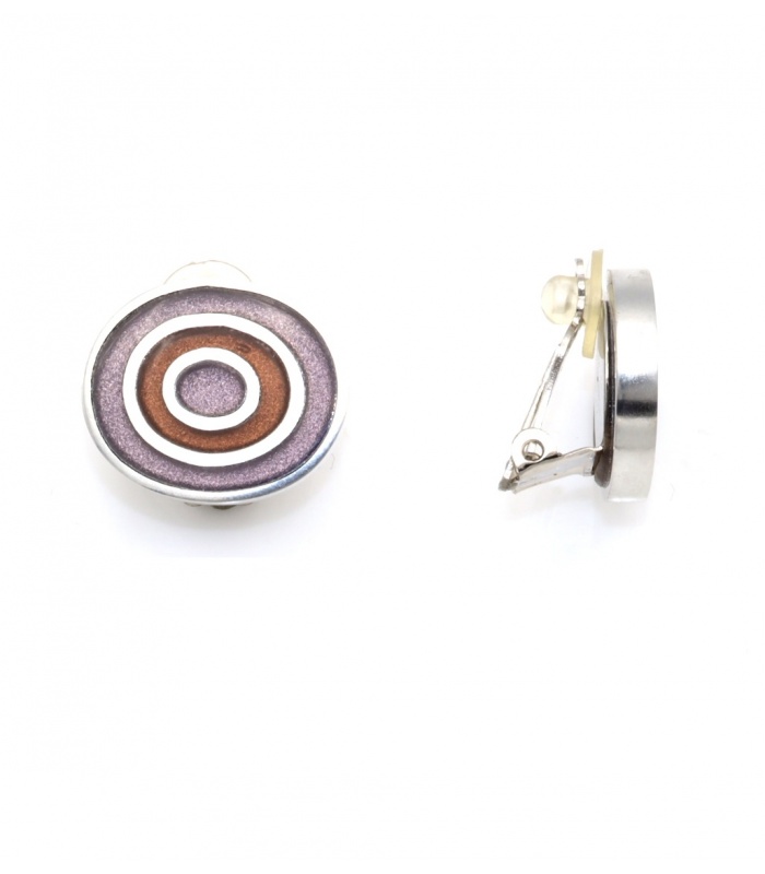 Wil je kleur toevoegen aan je look zonder te overdrijven? Deze ronde oorclips combineren metallic paars met koperkleurig accenten in een strak cirkelpatroon. De grafische vorm en het subtiele glanseffect zorgen voor een speelse maar stijlvolle uitstraling.