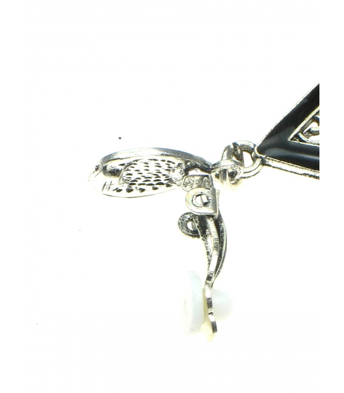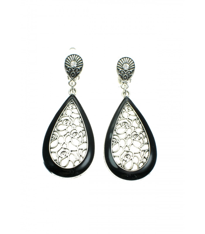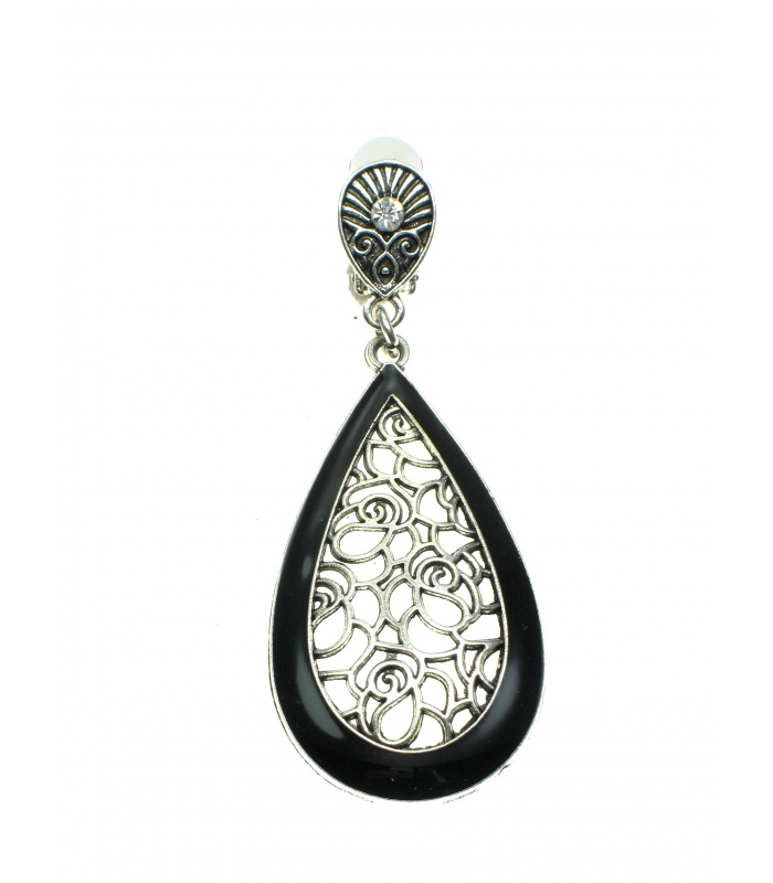 Opengewerkte oudzilverkleur oorclips met ovale hanger en zwarte accenten.