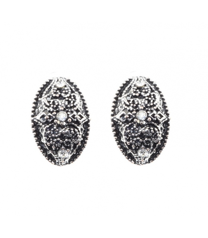 Zilverkleurige ovale oorclips met drie strass steentjes.