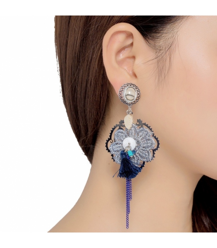 Zilverkleurige oorclips met een grijze stoffen bloem en blauwe kwast en paarse strengen