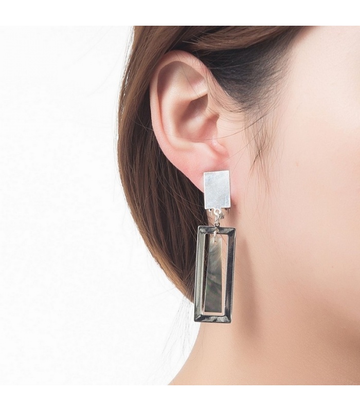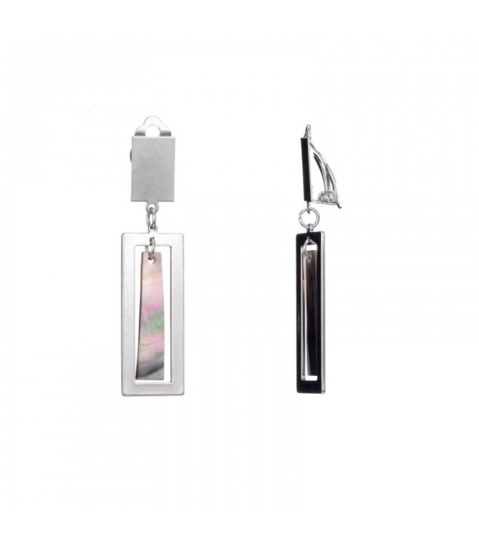 Zilverkleurige oorclips met rechthoekige lange hanger en parelmoer.