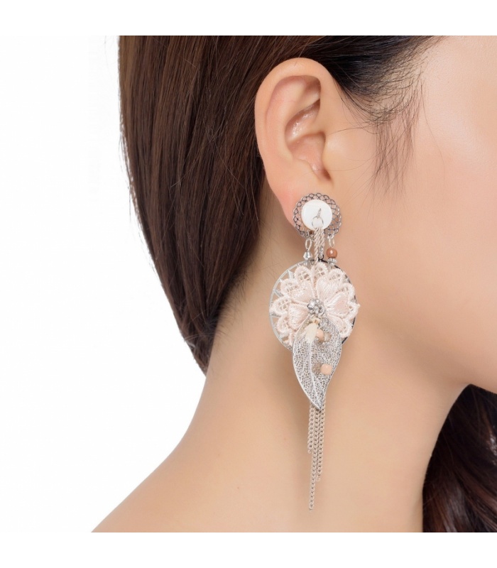 Zilverkleurige oorclips met roze stoffen bloem en bedels