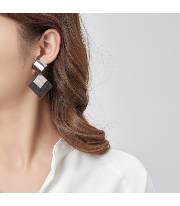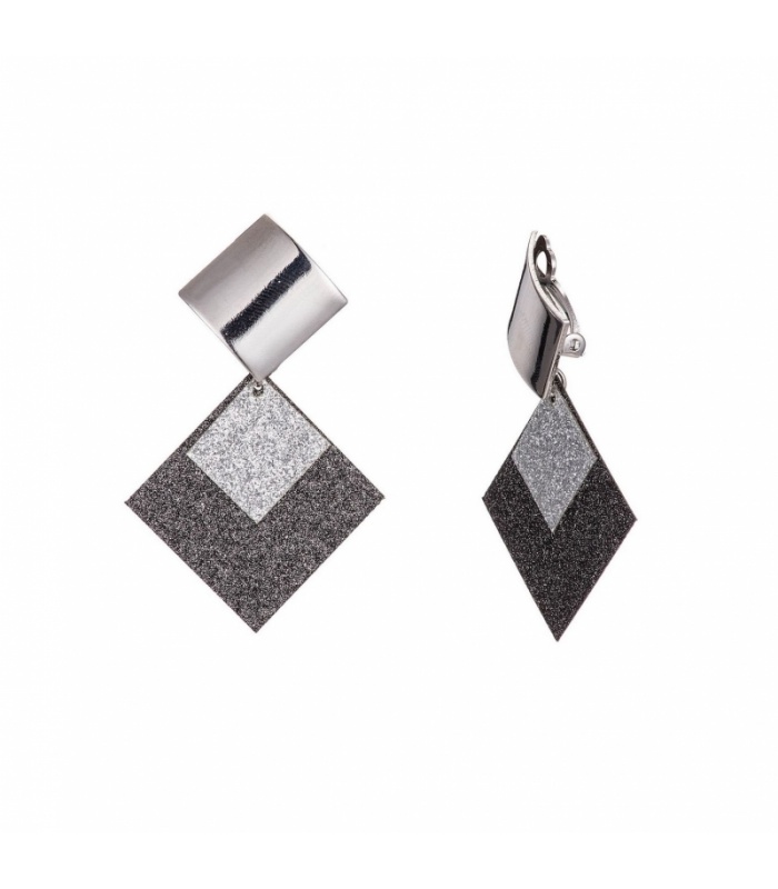 Zilverkleurige oorclips met zwarte en zilverkleurige ruitvormige hanger