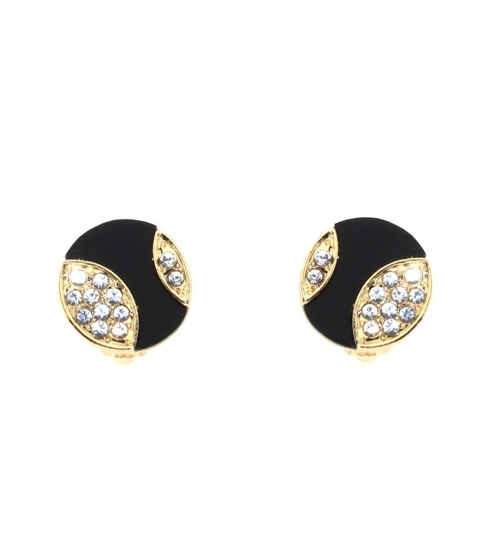 Deze goudkleurige oorclips combineren een zwarte inleg met fonkelende strassteentjes. Het elegante ontwerp voegt een vleugje glamour toe aan elke outfit. Perfect voor zowel dagelijkse als feestelijke gelegenheden.