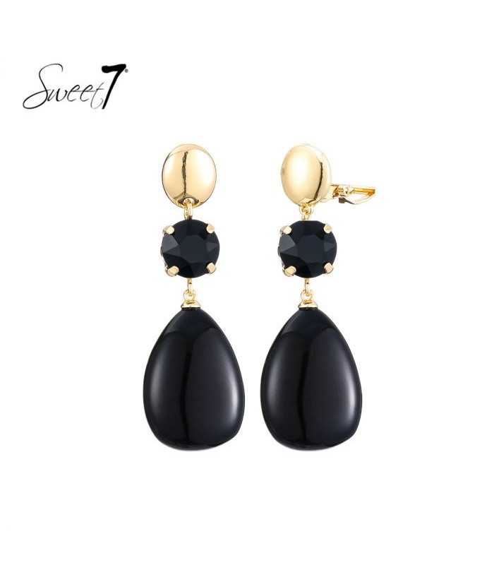 Wil je opvallen met elegante oorbellen, maar heb je geen gaatjes? Deze zwarte oorclip van Sweet7 biedt de perfecte mix van stijl en comfort. De combinatie van een glanzende zwarte druppelvorm en gouden accenten straalt pure elegantie uit.