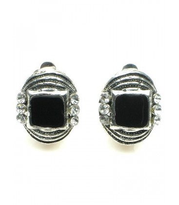 Ovale zwarte oorclips met heldere strass steentjes. De achterzijde van de clipoorbel is zilverkleurig. Lengte van de oorclip is 2 cm.