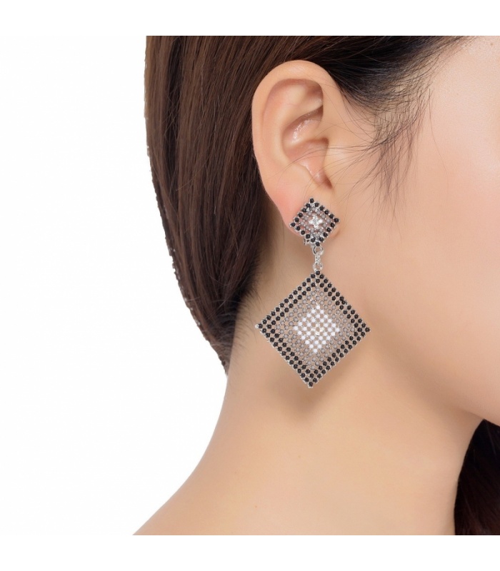 Ruitvormige oorclips met kleine zwarte kraaltje en heldere strass steentjes