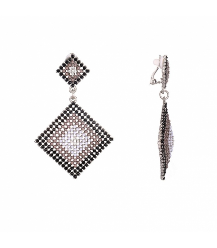 Ruitvormige oorclips met kleine zwarte kraaltje en heldere strass steentjes.
