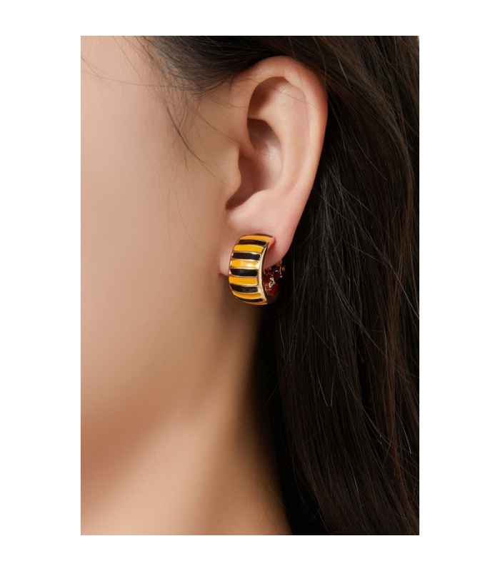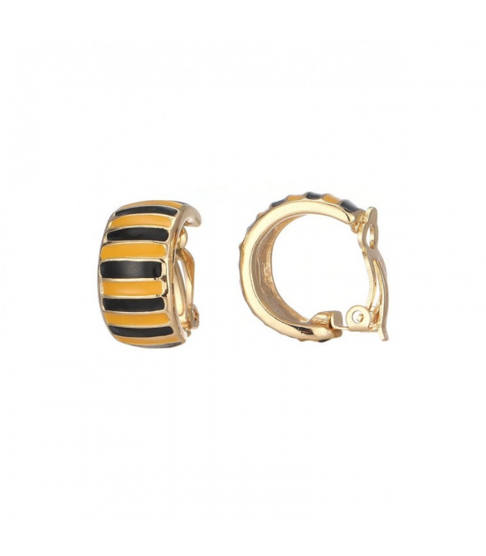 Deze oorclips combineren een opvallend zwart-geel gestreept patroon met een comfortabele pasvorm. Ze zijn ideaal voor wie geen gaatjes heeft, maar toch stijlvolle oorbellen wil dragen. De clips zijn nikkelvrij en voorzien van zachte rubbertjes voor extra draagcomfort.