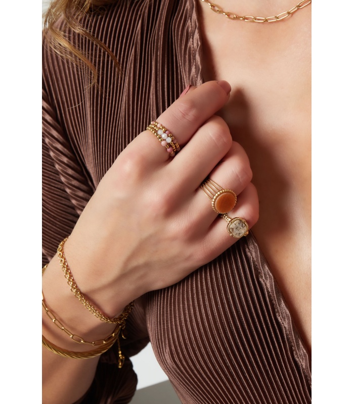 Voeg een vleugje elegantie toe aan je sieradencollectie met deze prachtige goudkleurige ring met een beige natuursteentje van Yehwang. De subtiele combinatie van de goudkleurige band en het beige steentje creëert een tijdloze en klassieke uitstraling die perfect past bij elke outfit.