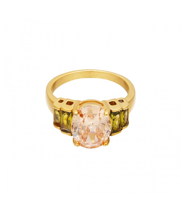 Goudkleurige ring met een roze ronde steen en groene steentjes (18).