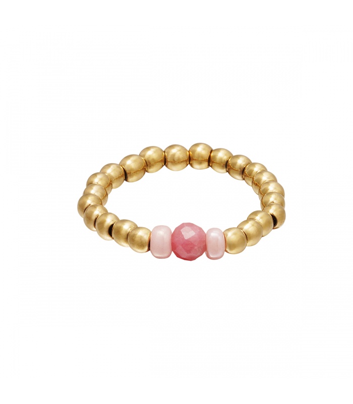 Teenring met goudkleurige kralen en drie lichtroze stenen.