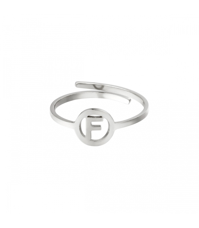 Zilverkleurige ring met initiaal F in cirkel.