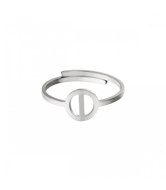 Zilverkleurige ring met initiaal I in cirkel.