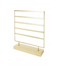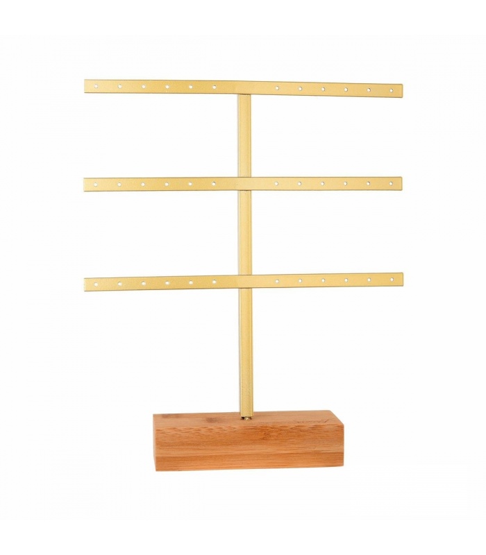 Deze elegante goudkleurige display met een blanke houten voet is de perfecte manier om je collectie oorbellen te presenteren. De combinatie van de goudkleurige stangen en de natuurlijke houten voet biedt een stijlvolle en rustieke uitstraling, waardoor deze display een luxe toevoeging is aan elke ruimte.