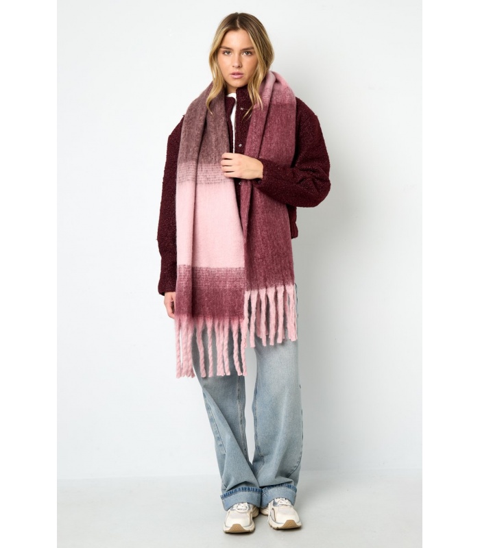 De zachte kleurblokken sluiten moeiteloos aan bij een neutrale of aardetint look. De lange franjes zorgen voor een speels effect, terwijl de oversized pasvorm warmte biedt. Ideaal voor zowel casual als geklede outfits. Deze winteraccessoire maakt elke outfit compleet.