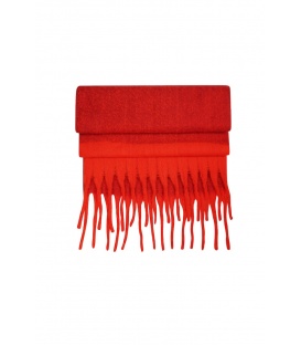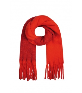 Rode wintersjaal met zwarte patroon. De afmeting van de sjaal is 190 bij 55 cm. De sjaal is gemaakt van polyester.