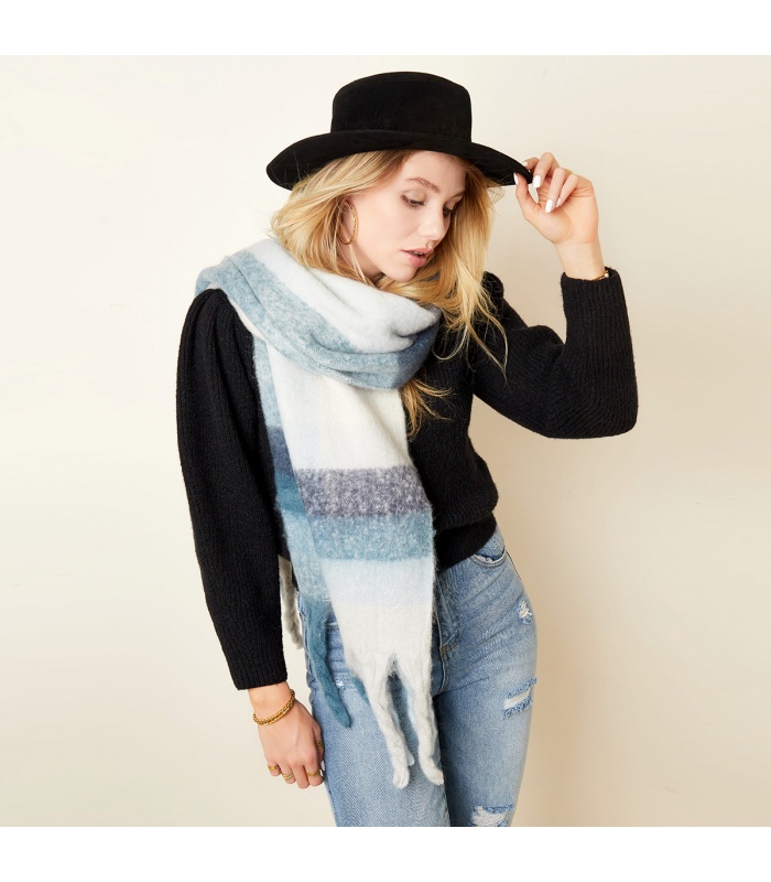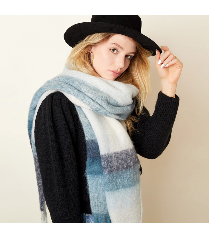 De brede banen en gedraaide franjes geven de sjaal een eigentijdse uitstraling. Perfect te combineren met een zwarte winterjas of juist als contrasterend accent. Deze must have winter accessoire is gemaakt om op te vallen en warm te blijven.
