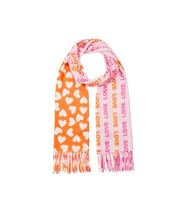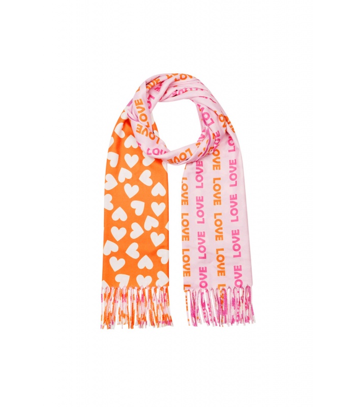 Oranje, roze zomer sjaal met hartjes en tekst.