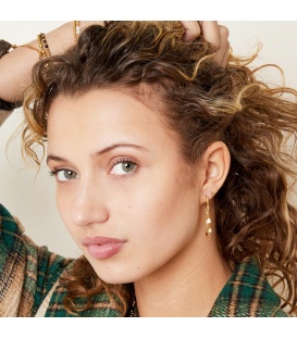 Goudkleurige oorringen met bungelende parels. De lengte van deze oorbel is 2.40 cm. Voor oren met gaatjes. Nikkelvrij.