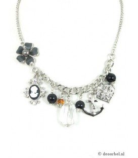 zilver met grijskleurige 3 strengs halsketting met kanten bloem