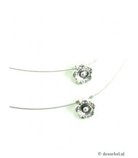 Zilverkleurige oorbellen in de vorm van een bloem met grijze steentjes